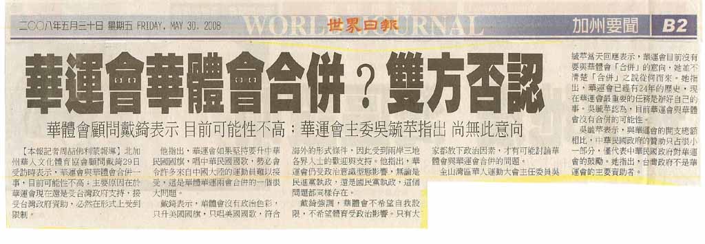 世界日報 - 華運會華體合併?雙方否認 (5/30/2008)